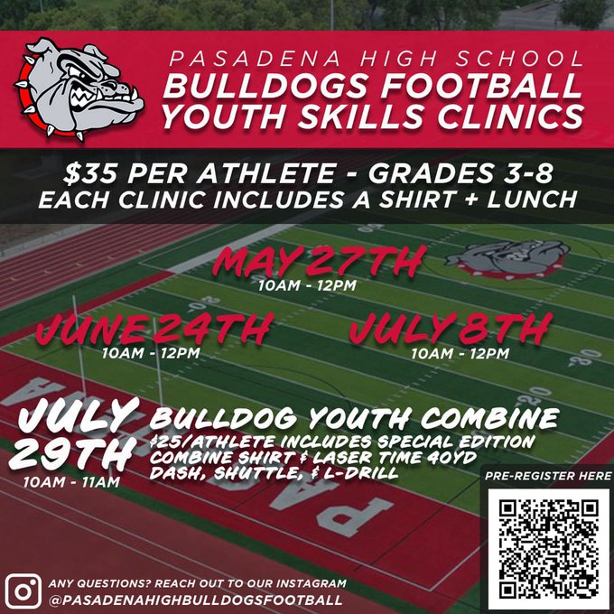 - Pasadena High School will host a youth football camp on July 8 and July 29 for grades 3-8. See details below.