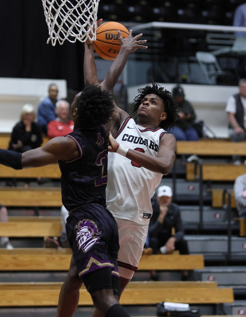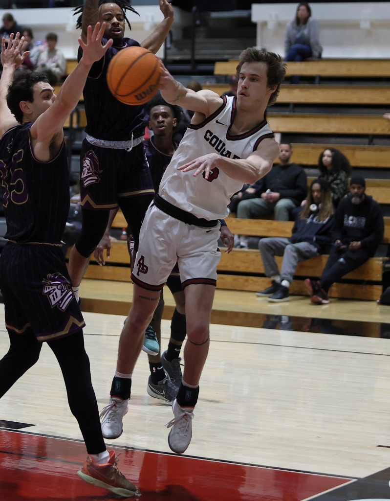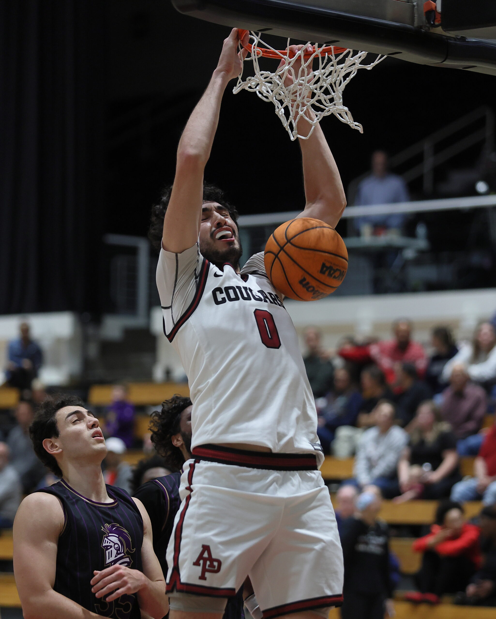 Chris Gayles Jr. scored 11 points to lead the way for APU in the first half. Charlie Gehler hit three consecutive three pointers early in the half as the Cougars forged ahead and had nine points while Michael Saba scored six including a slam at the 6:32 mark that rocked the house and rattled the rim. Tobias Aisien also added six points.