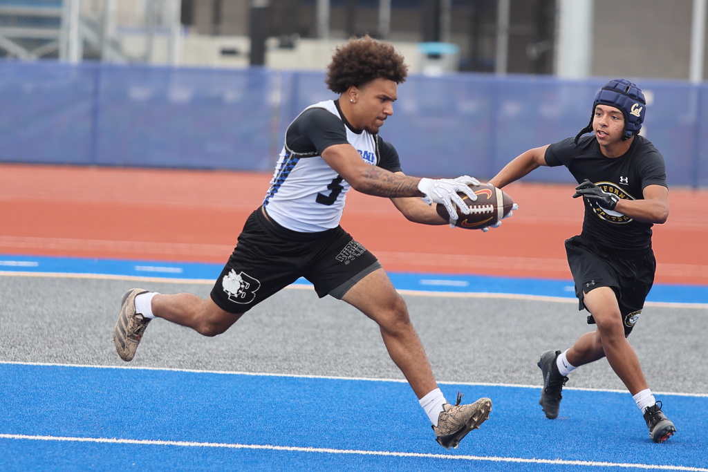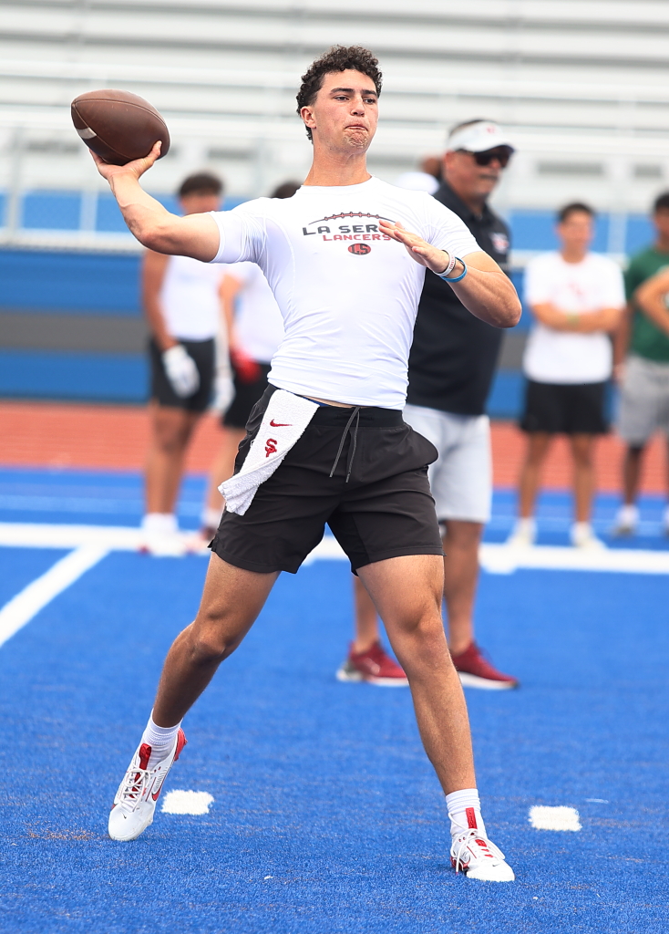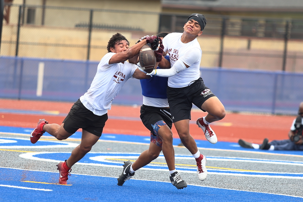 La Serna won as expected, a bit surprised that they had to grind it out against ER and almost went down but the ER WR dropped the winning TD in regulation, LS always deep with lots of solid ball players, a kid with a black cap on his head was all over the field for them. Not sure what went down in that Schurr vs Burbank game, but it seemed like it was getting ugly between the parents, earlier in the day I was over at the other field along Rosemead and saw Schurr got into a little dust up, kind of a shame to see it happen again later in the day. I know the coach is new and a really nice up and coming guy, but the more of those off season 7v7s you do the more your team takes on that type of attitude and culture, hope they can get that under control. The QB for ER surprised me, he was slinging that rock, that WR with the glasses is raw but looks like he’s got some nice length and runs some good routes, I heard ER lost a ton of seniors they didn’t seem to miss a beat, solid if you ask me. What the heck happened to Northview and San Dimas?
