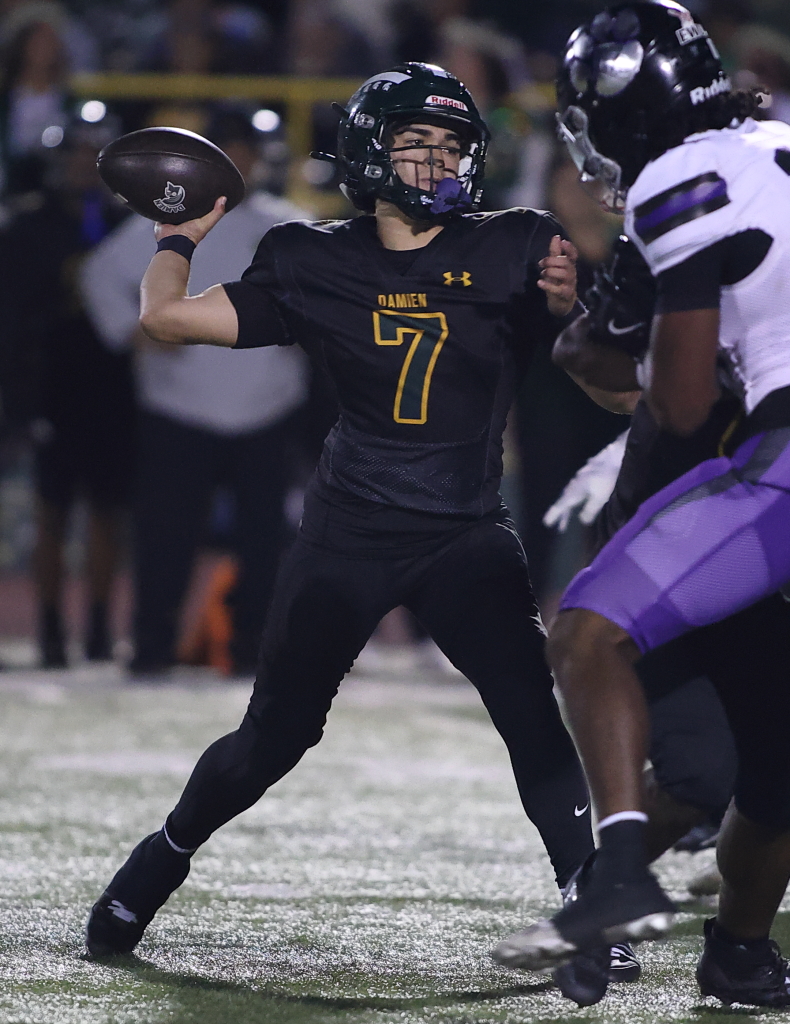 After Arriaza was intercepted in the endzone by Nate Mensah on Damien’s first possession, Rancho Cucamonga went up 10-0 early on 38-yard field goal by Romano Annecchini and a two-yard run by James Strong III with 2:31 left in the first quarter.