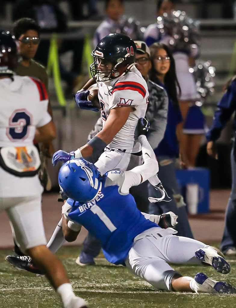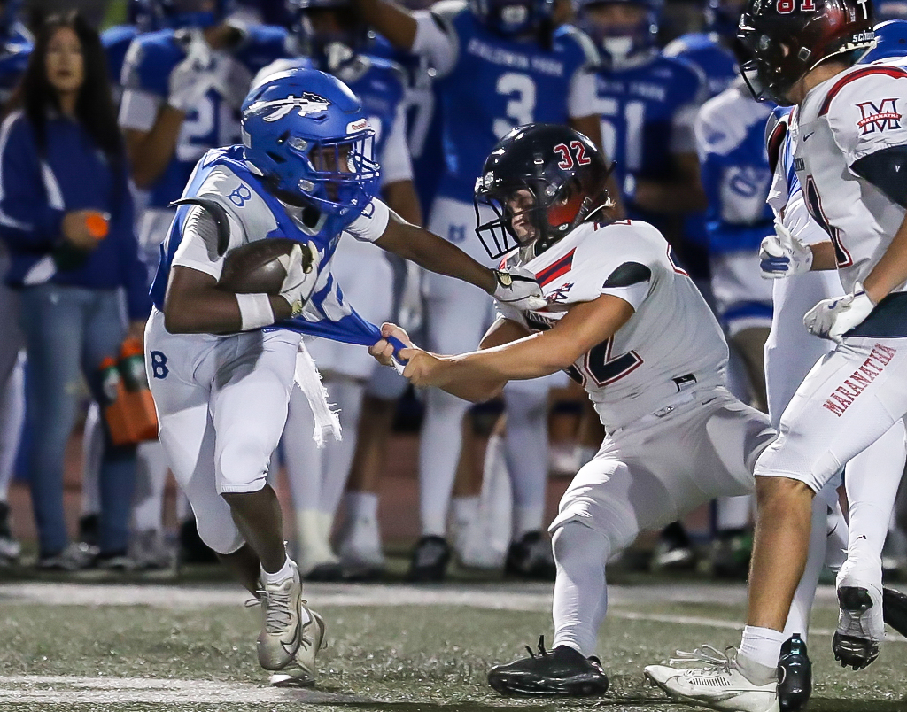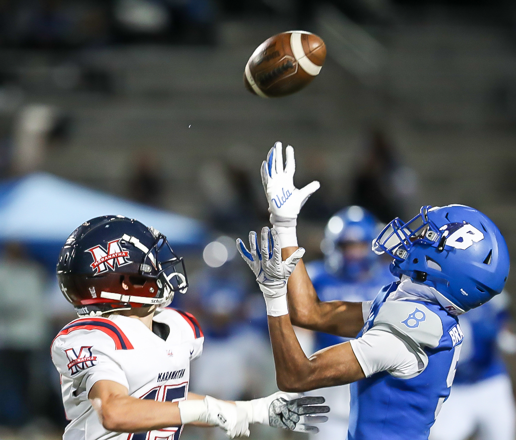 Maranatha’s George Pamilton III (#18) runs for yardage during a first round CIF Southern Section Ford playoff football game between the Baldwin Park Braves and the visiting Maranatha Minutemen in Baldwin Park, CA on November 7, 2025. (Photo by David Thomas)Baldwin Park’s Valentino May (#13) looks to pass during a first round CIF Southern Section Ford playoff football game between the Baldwin Park Braves and the visiting Maranatha Minutemen in Baldwin Park, CA on November 7, 2025. (Photo by David Thomas)Maranatha’s Nico Vergara (#14) is forced out of bounds by Baldwin Park’s Billy Carr (#1) during a first round CIF Southern Section Ford playoff football game between the Baldwin Park Braves and the visiting Maranatha Minutemen in Baldwin Park, CA on November 7, 2025. (Photo by David Thomas)Maranatha’s Cooper Berry (#13) runs for yardage during a first round CIF Southern Section Ford playoff football game between the Baldwin Park Braves and the visiting Maranatha Minutemen in Baldwin Park, CA on November 7, 2025. (Photo by David Thomas)Maranatha’s Nick Goodman (#32) brings down Baldwin Park’s Jacory Coleman (#12) during a first round CIF Southern Section Ford playoff football game between the Baldwin Park Braves and the visiting Maranatha Minutemen in Baldwin Park, CA on November 7, 2025. (Photo by David Thomas)Maranatha’s Luke Hanrahan (#15) and Baldwin Park’s Jayden Maxie (#5) battle for a loose ball during a first round CIF Southern Section Ford playoff football game between the Baldwin Park Braves and the visiting Maranatha Minutemen in Baldwin Park, CA on November 7, 2025. (Photo by David Thomas)Baldwin Park’s Jacory Coleman (#12) runs for yardage during a first round CIF Southern Section Ford playoff football game between the Baldwin Park Braves and the visiting Maranatha Minutemen in Baldwin Park, CA on November 7, 2025. (Photo by David Thomas)