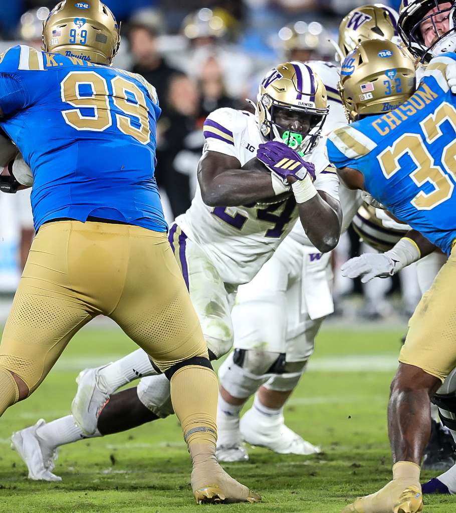 Washington Huskies running back Adam Mohammed (24) runs for yardage during a Division 1 college football game between the UCLA Bruins and the visiting Washington Huskies on November 22, 2025 at the Rose Bowl in Pasadena, CA (Photo by David Thomas)