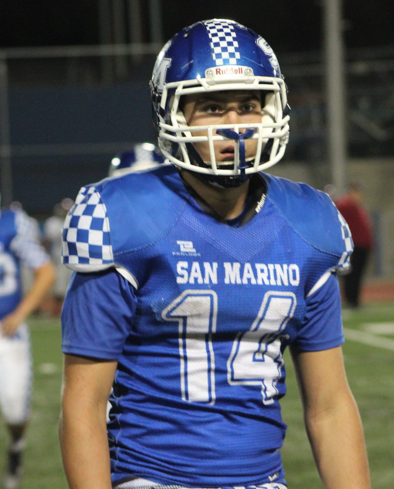 Bell Gardens lone highlight of the night came late in the first quarter. Augustin Velasquez Jr. found Gabriel Campos Jr. behind the San Marino secondary for 78-yard touchdown pass. Campos caught the ball in stride and took it to the house. Unfortunately for the Lancer faithful it was all San Marino from then on.