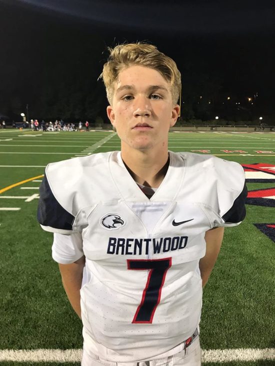 (Pasadena)— Brentwood quarterback Cole Lourd threw for 245 yards and tossed two touchdowns in the Eagles 42-9 win over Maranatha Friday night at Maranatha High school.
