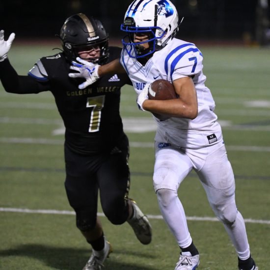 Brandon Pena caught a touchdown pass for Burbank but the Bulldogs fell to Golden Valley. (Photo by Doug Brown).