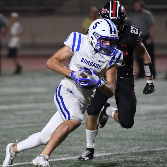 Burbank receiver Ben Burnham had two touchdown receptions but it wasn’t enough in a loss to Hart. (Photo by Doug Brown).
