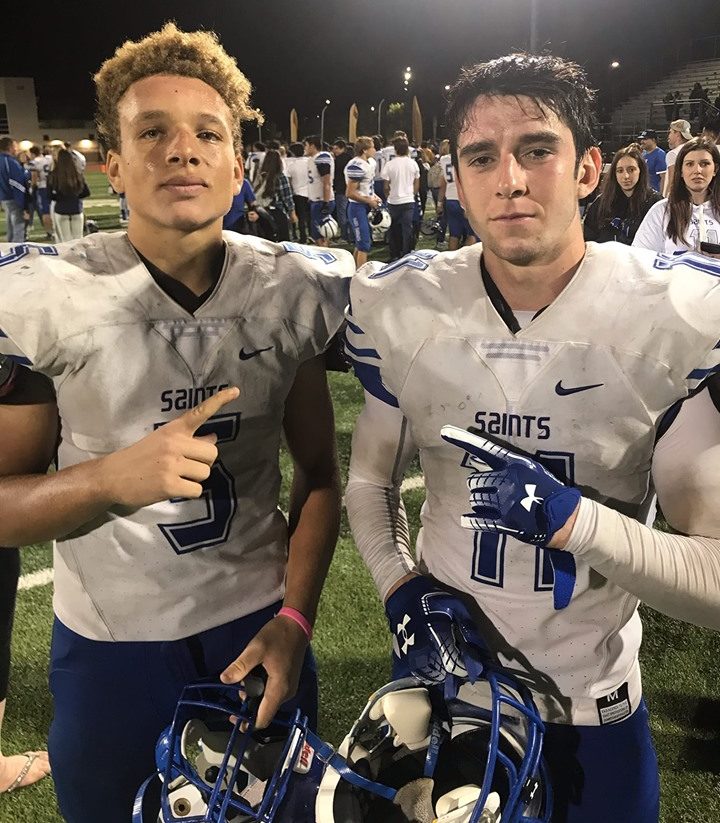 (Covina) — The San Dimas Saints dynamic duo of Bleau Wallace and Nick Cuda scored all four touchdowns leading their team to a 27-13 win over Northview in the Valle Vista League opener Friday night at Covina District Field.