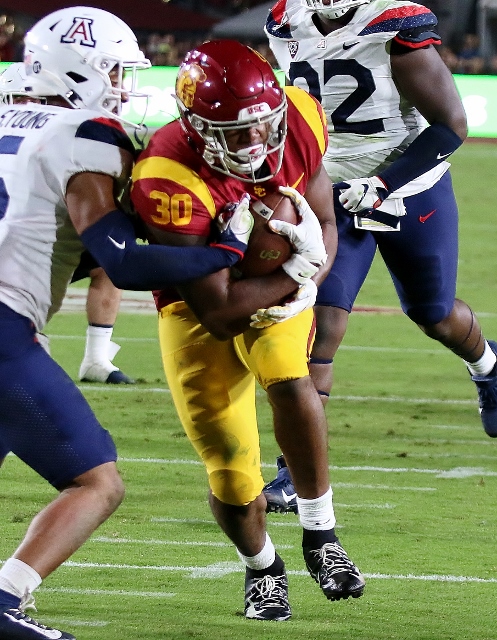 Castell finished with four catches for 101 yards and the two scores for Arizona. Gunnell came off the bench to complete 16 of 26 for 196 yards and two touchdowns with an interception.For the Trojans, Slovis was 19 of 28 for 232 yards and two touchdowns. Christon had eight carries for 103 yards and the two big touchdown runs. Pittman had four receptions for 69 yards and a score and Vaughns had seven for 73. Stepp had 13 carries for 66 yards and a touchdown before leaving with an ankle injury.