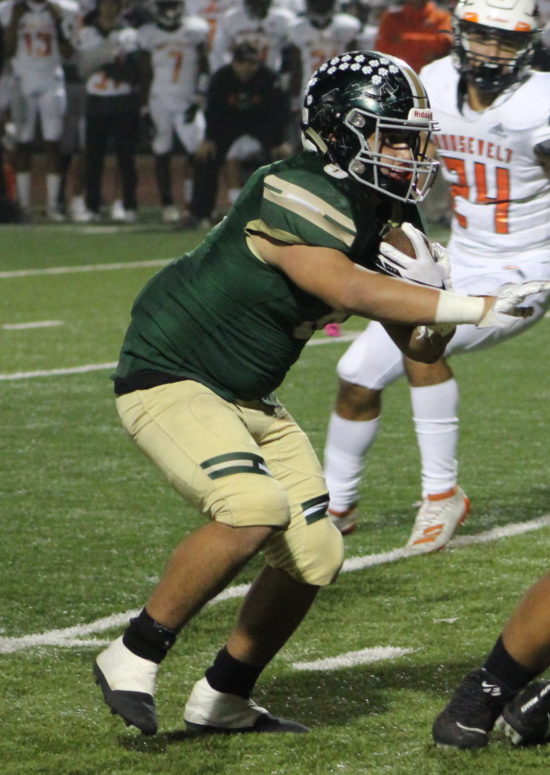 South Hills’ onside kick failed and Roosevelt took over at its own 46. But a high snap over the head of quarterback Xavier Ward resulted a fumble and suddenly the Huskies were right back in business at the Roosevelt 31 with 2:15 left.