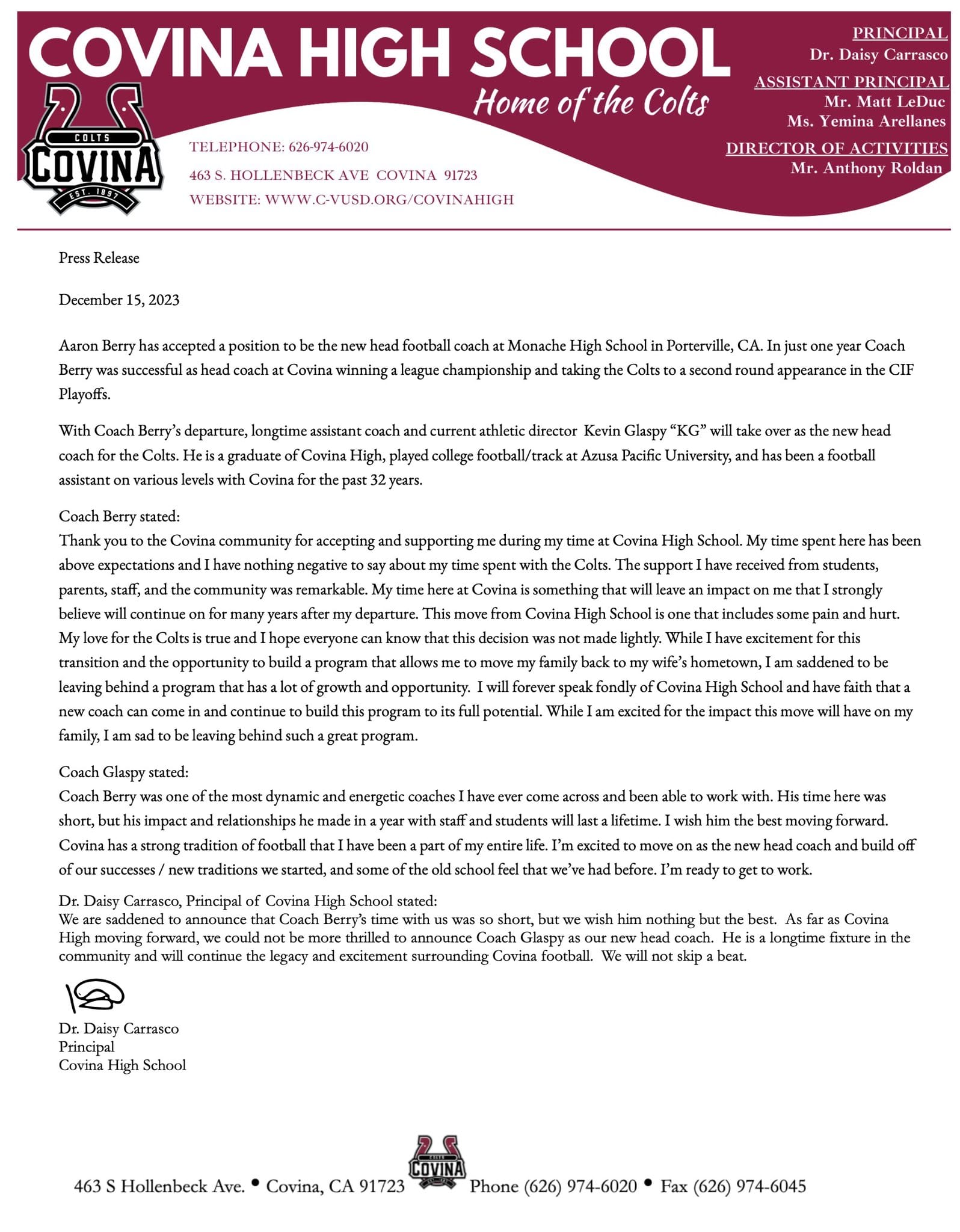“I enjoyed my time at Covina. It was positive and it was a hard decision to leave,” Berry said. “But Porterville is my wife’s hometown and this was the best move for my family. I look forward to building the program over there.”