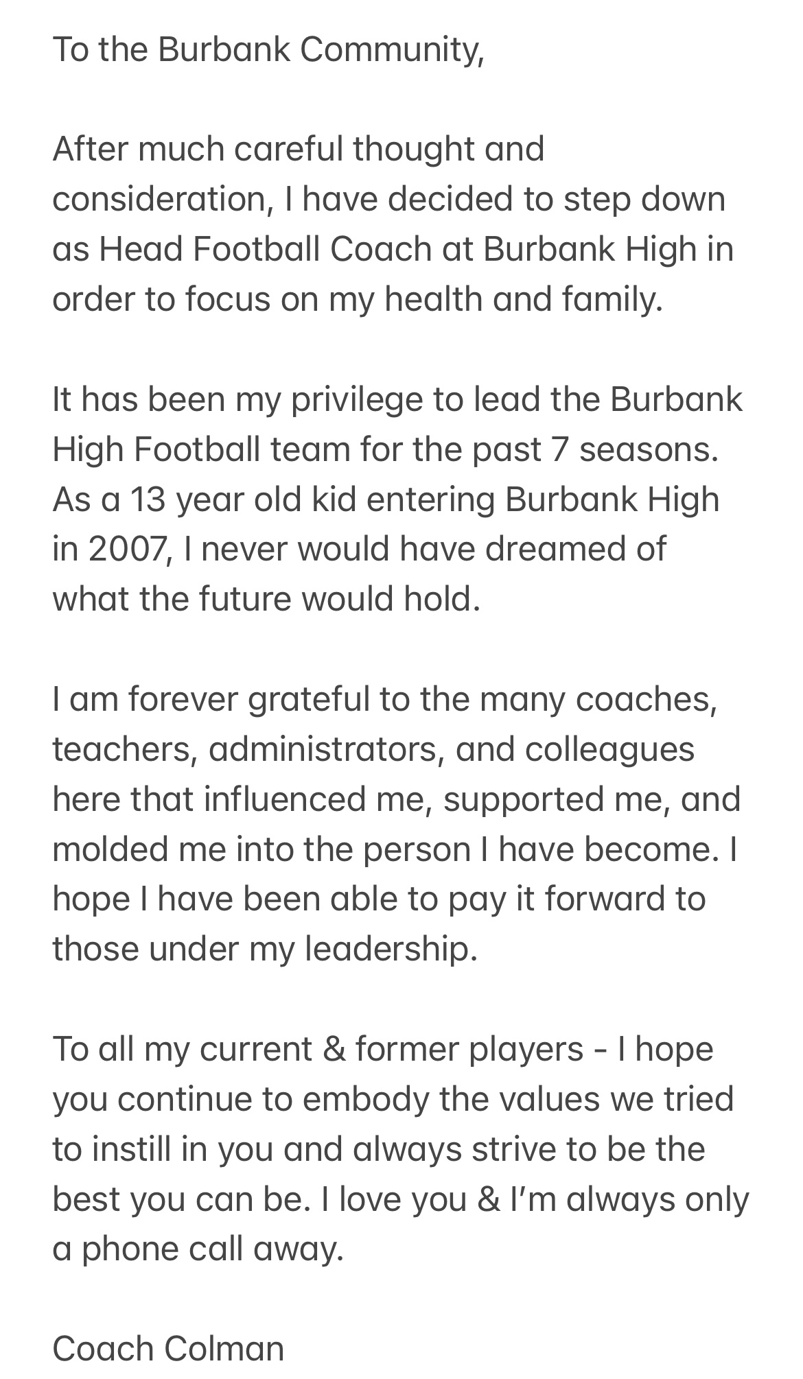 (Burbank) – Adam Colman has stepped down as the head football coach at Burbank after seven years he posted on Twitter (X) Tuesday.
