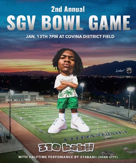 The SGV Bowl is set for this Saturday January 13 at Covina District Field. 310 Babii will perform at halftime. Kickoff is scheduled for 7:00 p.m.
