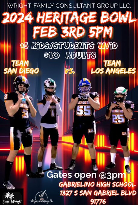 The Heritage Bowl featuring Team San Diego vs. Team Los Angeles will take place this Saturday February 3 at Gabrielino High School. Kickoff is set for 5:00 p.m.